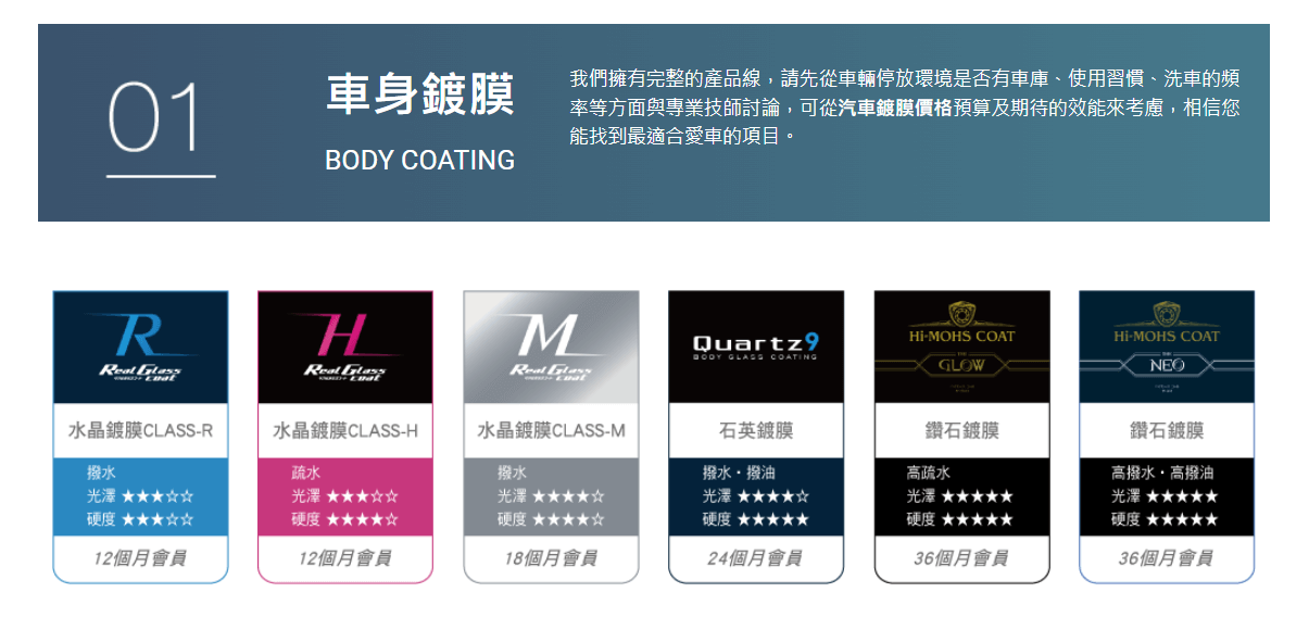 這是現在台灣汽車美容店最常見的高階主力名稱之一,通常訴求比入門型鍍膜更好的耐久性、表面硬度、抗化學性與長期保護。