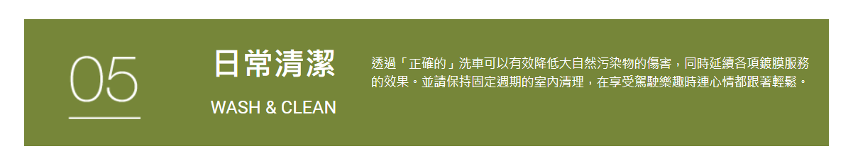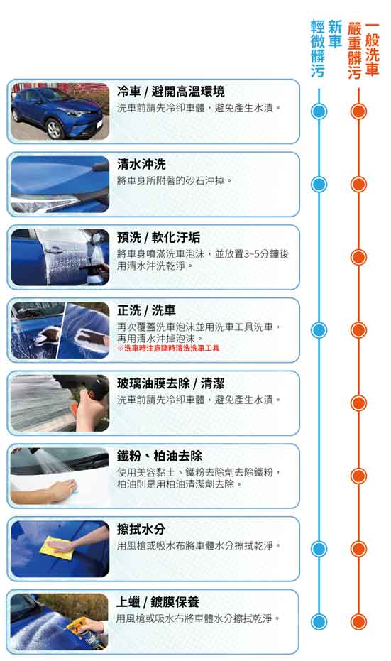 使用中性洗車精、不含蠟與鹼性物質,可保護鍍膜層。